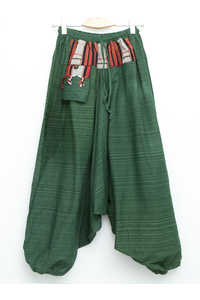 На поясе вставка из декоративного гобелена и эластичная резинка, благодаря которой штаны имеют свободный размер.