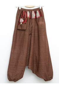 На поясе вставка из декоративного гобелена и эластичная резинка, благодаря которой штаны имеют свободный размер.