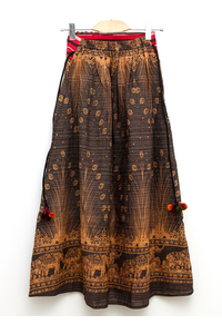 На поясе спереди вставка из декоративного гобелена, сзади - эластичная резинка, благодаря которой юбка имеет свободный размер.