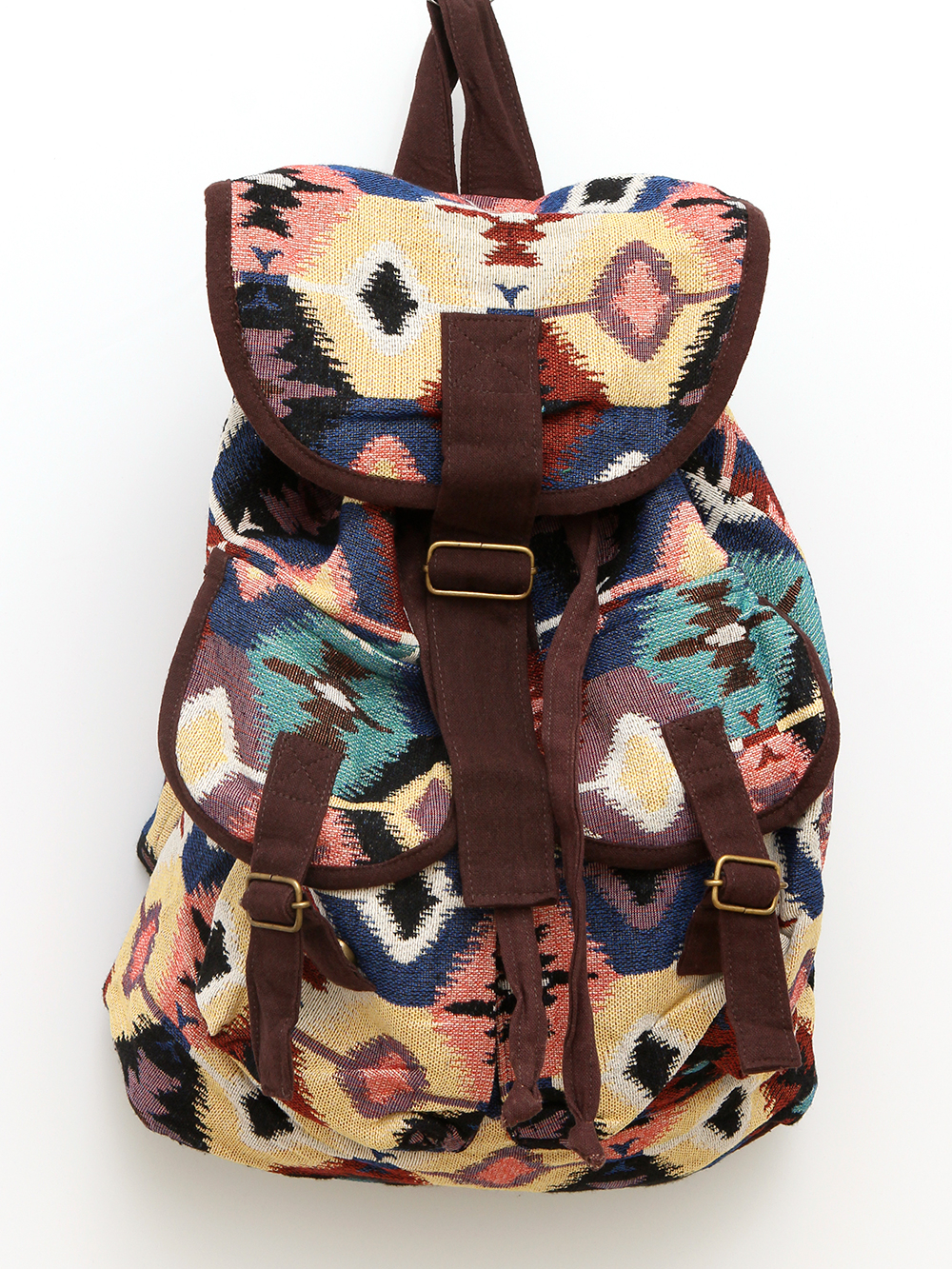 Рюкзак с подкладкой, закрывается на клепку и затягивается шнурами.