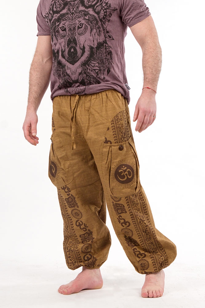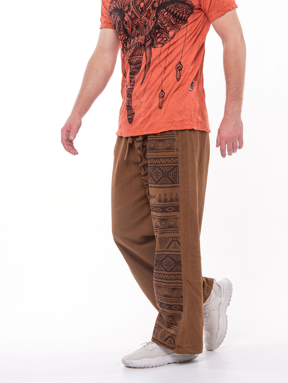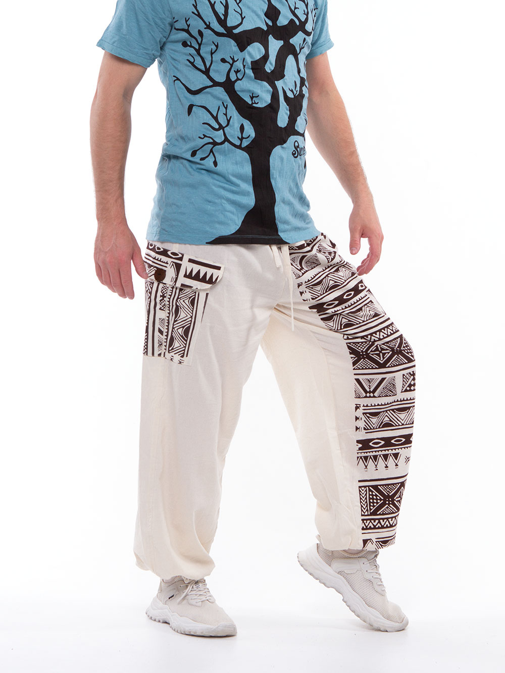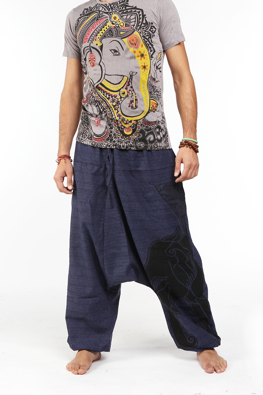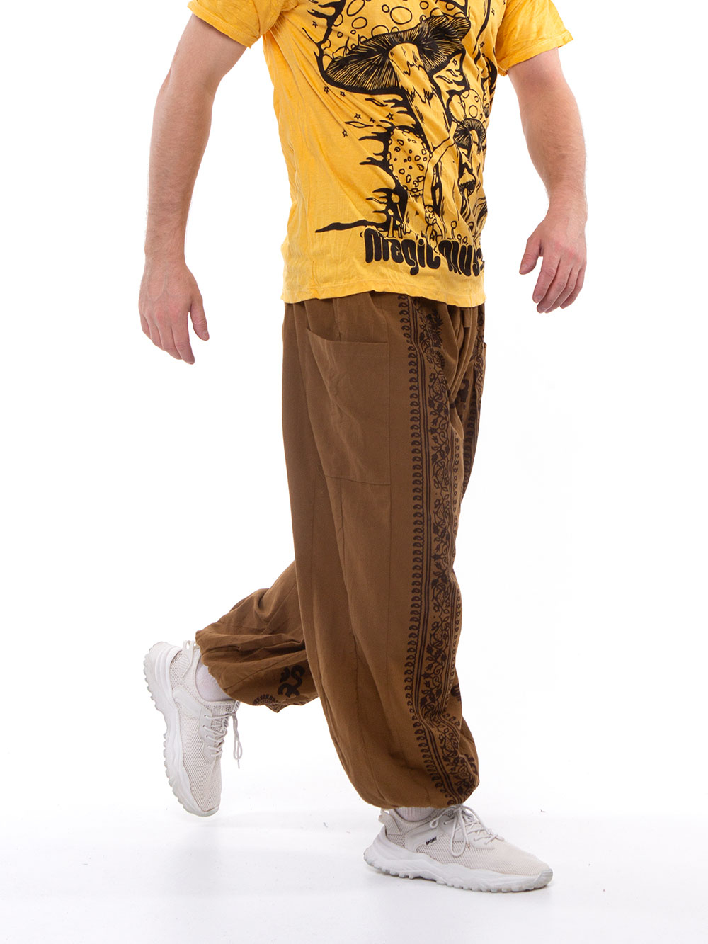 На поясе вставка из декоративного гобелена и эластичная резинка, благодаря которой штаны имеют свободный размер.