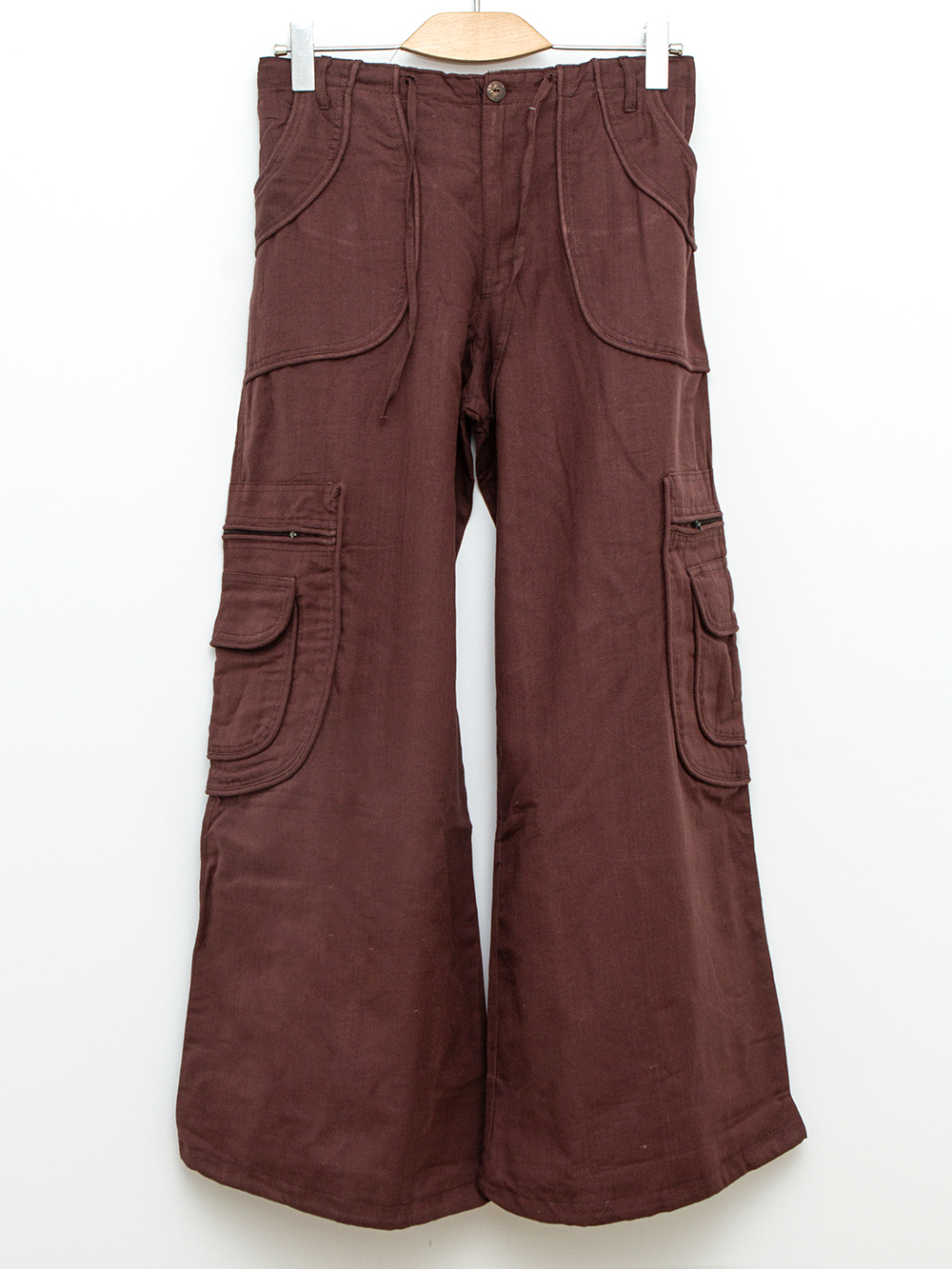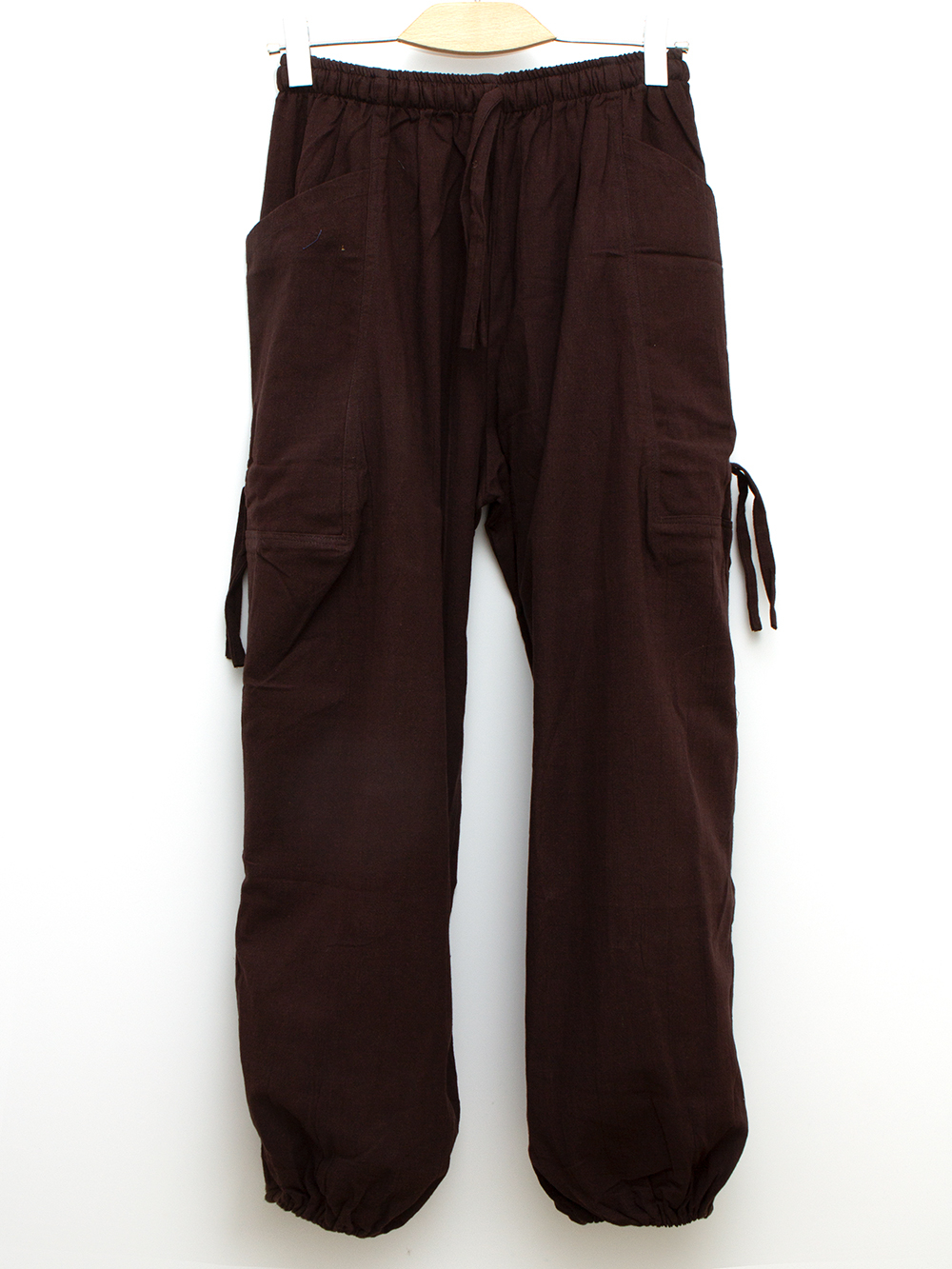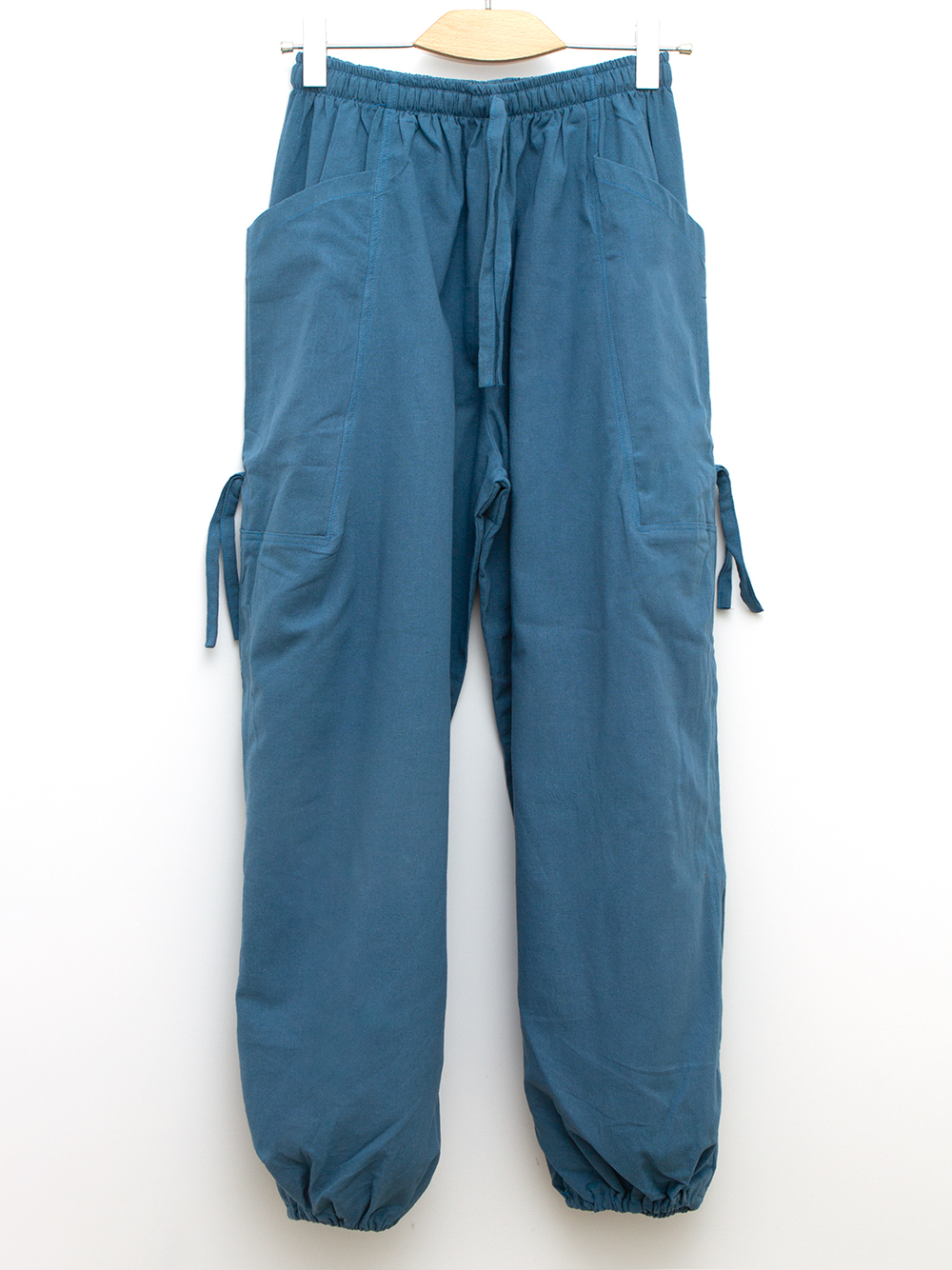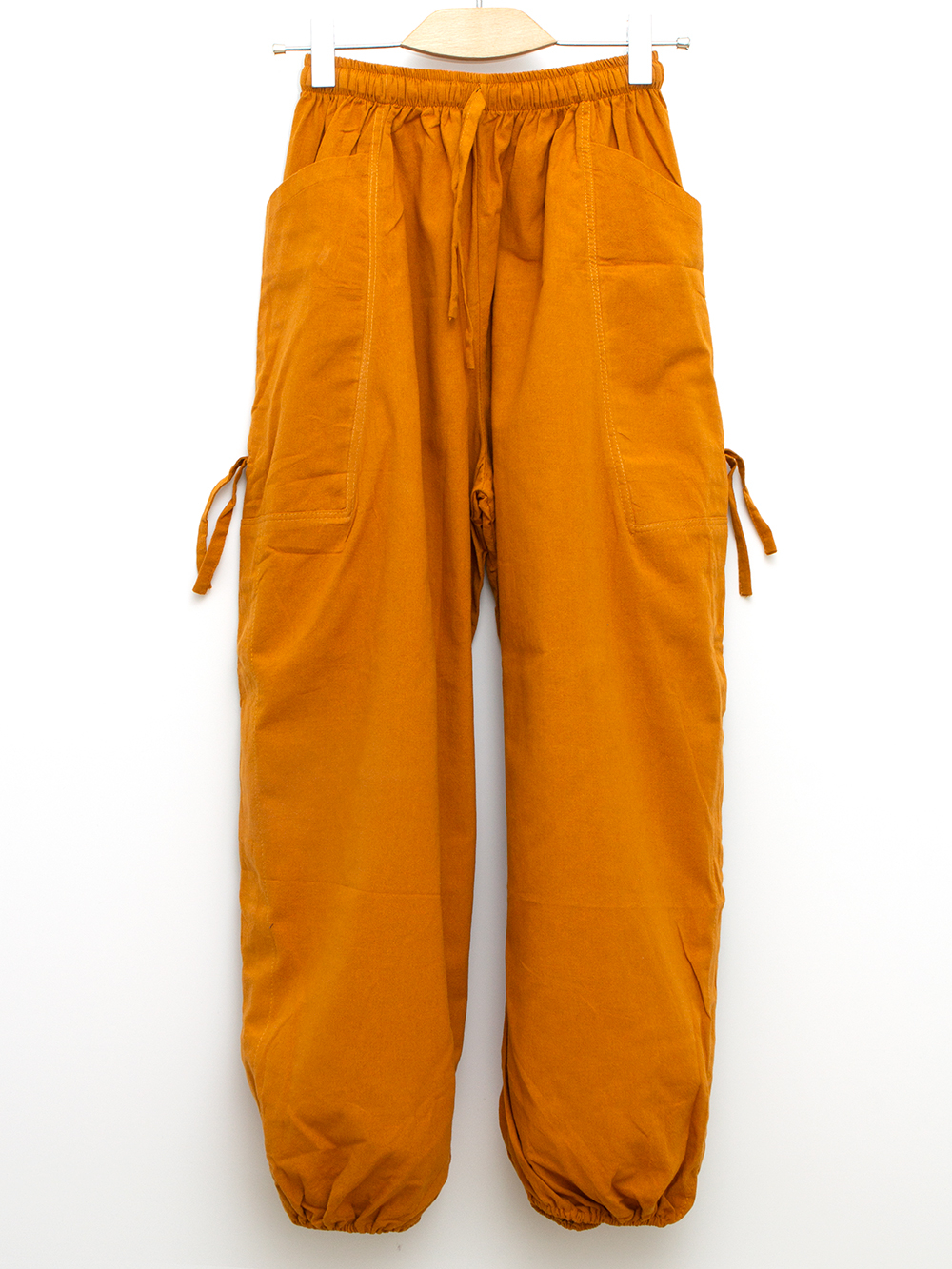 Брюки отделаны резинкой и затягиваются с помощью тканевого пояска.