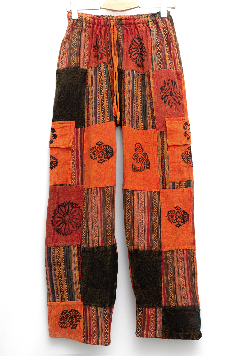 На поясе вставка из декоративного гобелена и эластичная резинка, благодаря которой штаны имеют свободный размер.