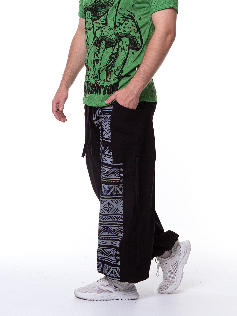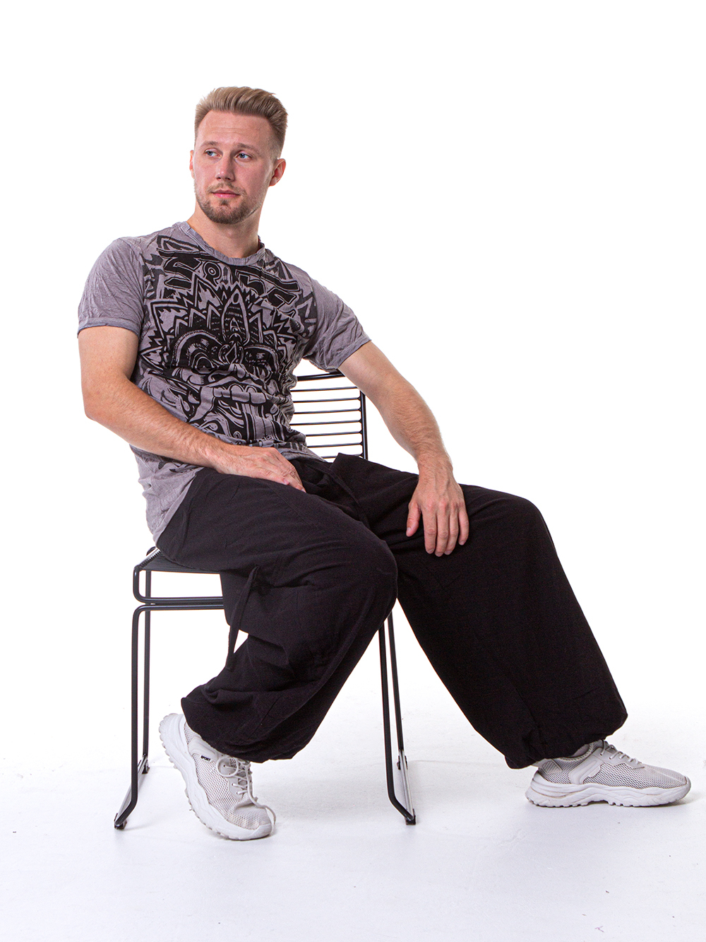На поясе - эластичная резинка, благодаря которой штаны имеют свободный размер.